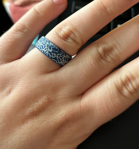 Here's our wedding band: image.png363 KB (image description: a wedding band on my hand, it is dark blue with white electrical sparks. end id.)