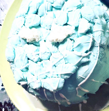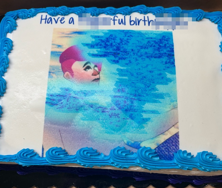 (image description: a birthday cake with white frosting and a blue icing trim. the text on it is pixelized and censored. on the cake is an edibly printed image of a drawing of a white nonbinary individual with short purple hair being embraced in the clouds by a blue glitching effect in the shape of a human. end id.)